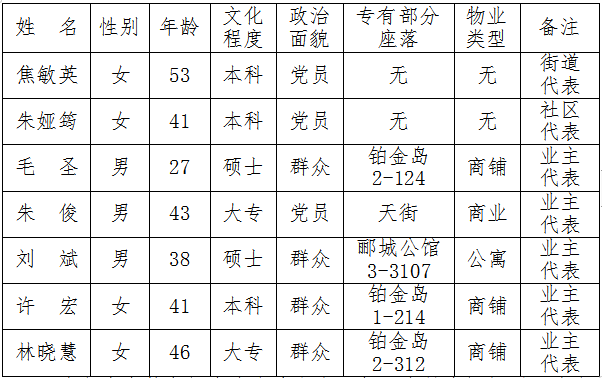 根据《物权法》、国家、省、市《物业管理条例》、住房和城乡建设部《业主大会和业主委员会指导规则》的相关规定,按照业主大会筹备组产生办法,确定以下7人作为江南天街商业中心业主大会筹备组成员。现将成员名单及工作职责公告如下: