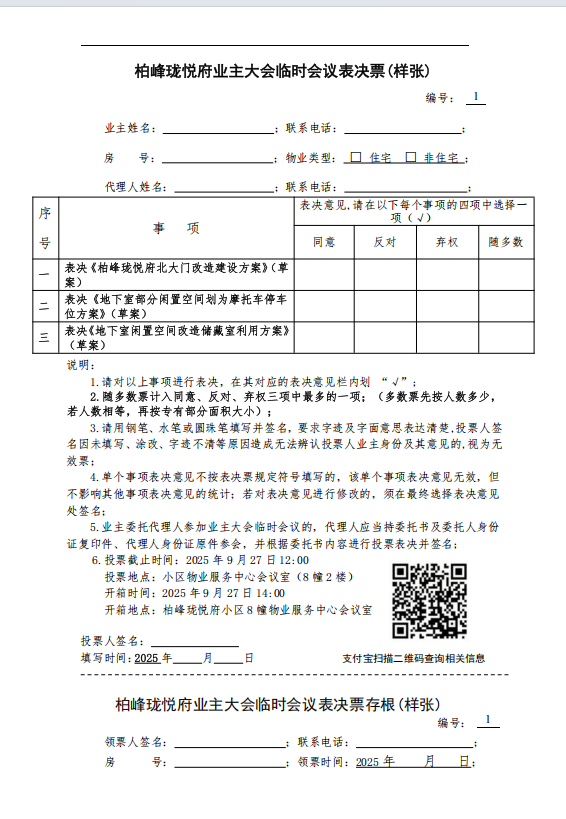柏峰珑悦府业主大会临时会议表决票(样张)