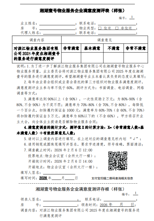 湘湖壹号物业服务企业满意度测评表(样张)