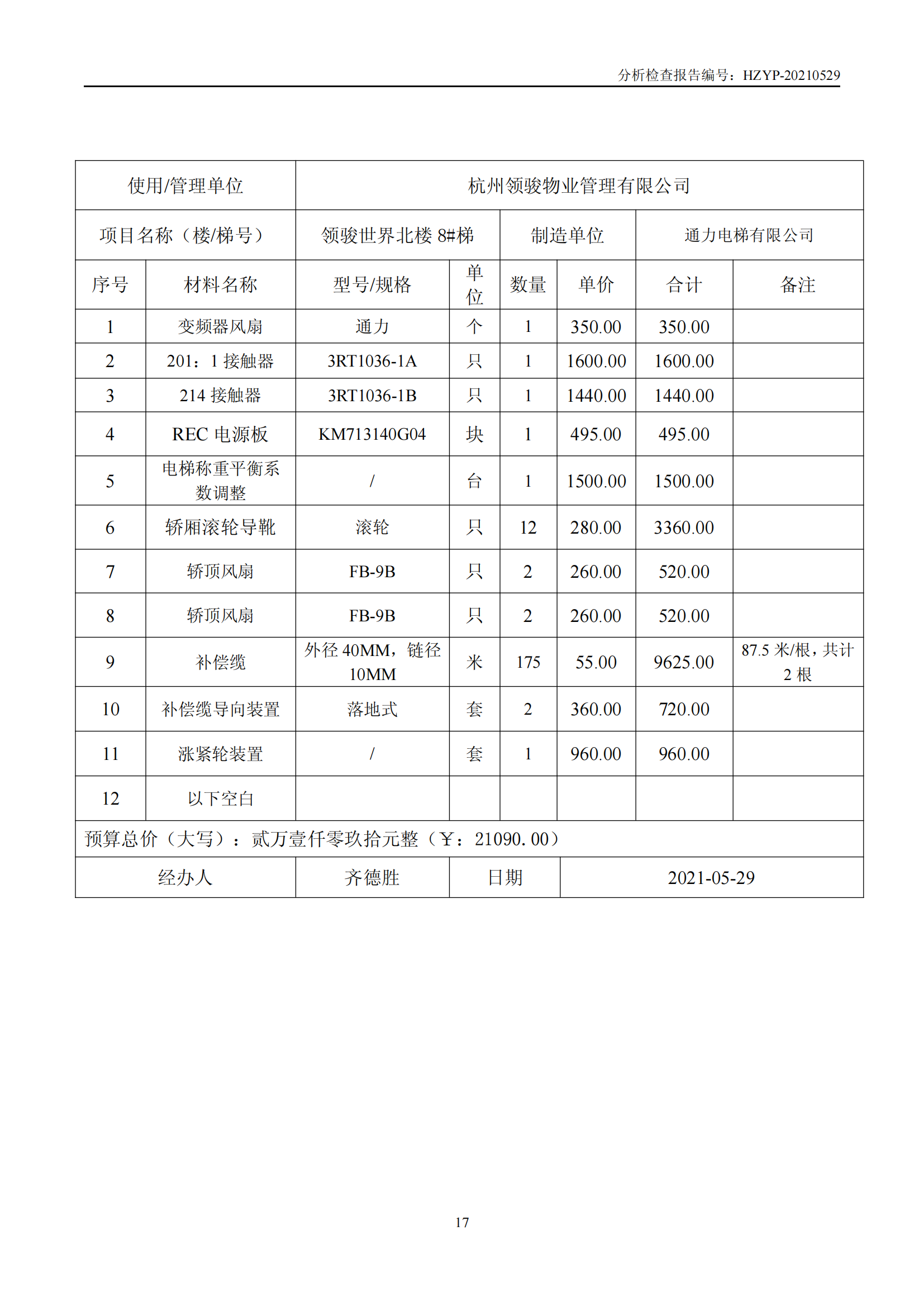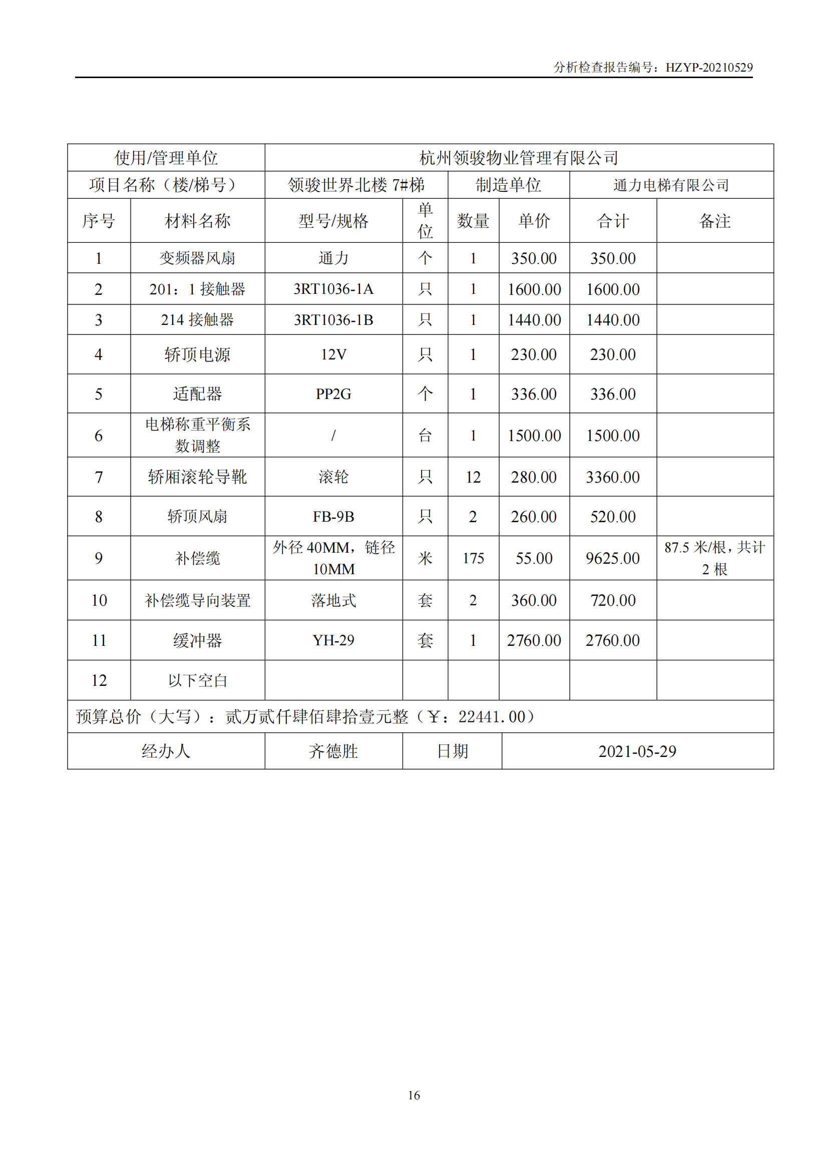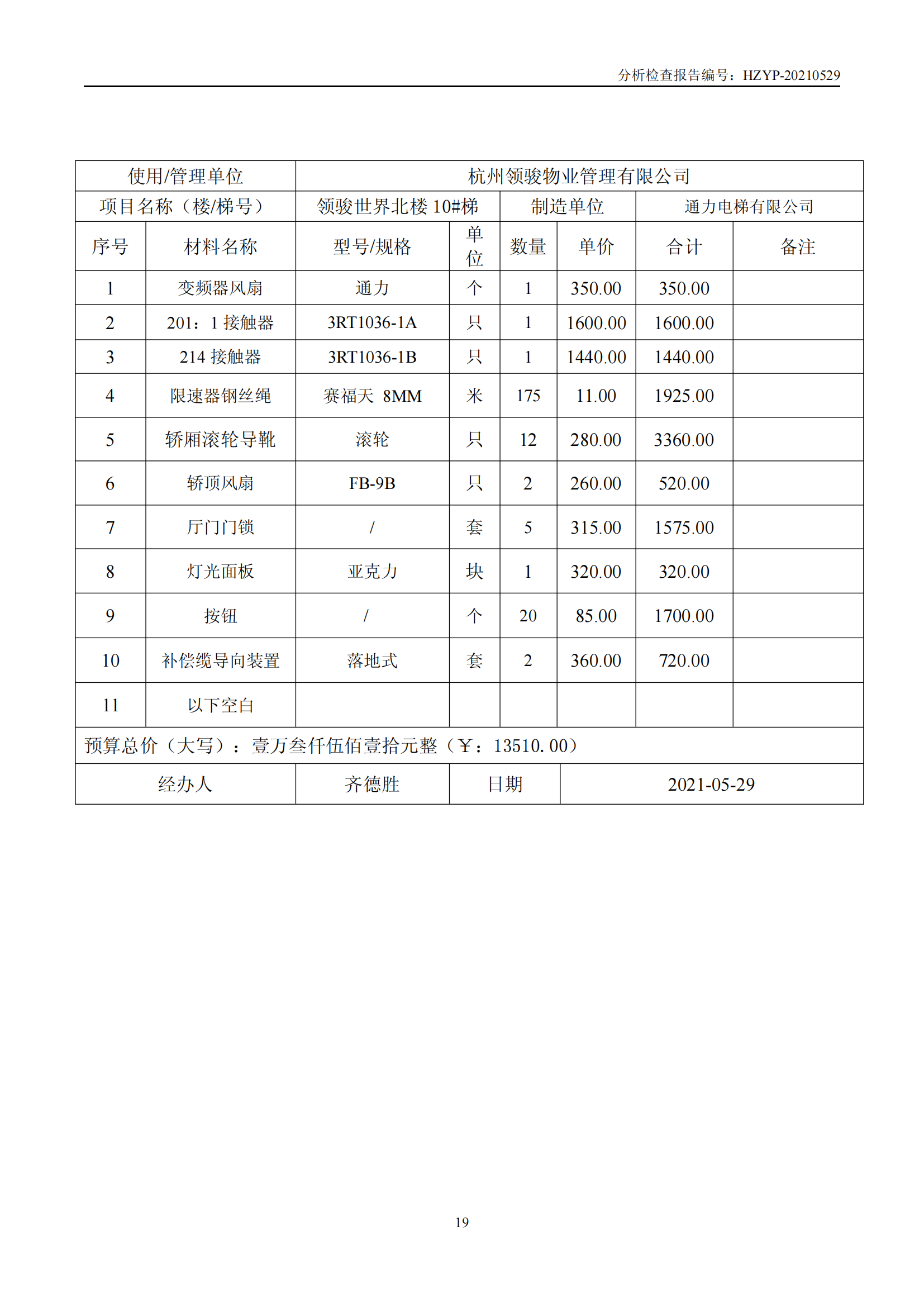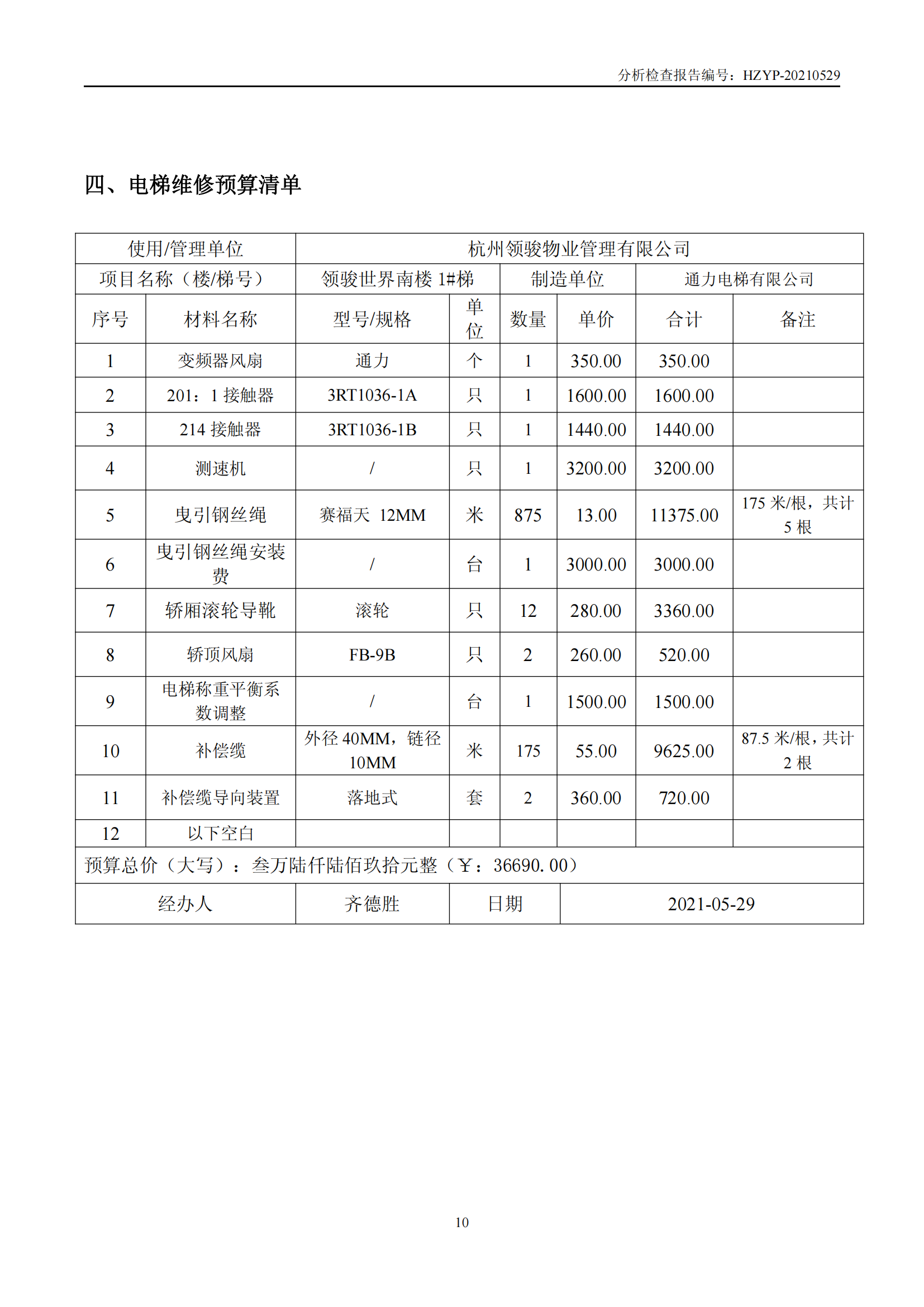领骏世界电梯维修概算(领 骏 世 界 电 梯 检 查 报 告)
