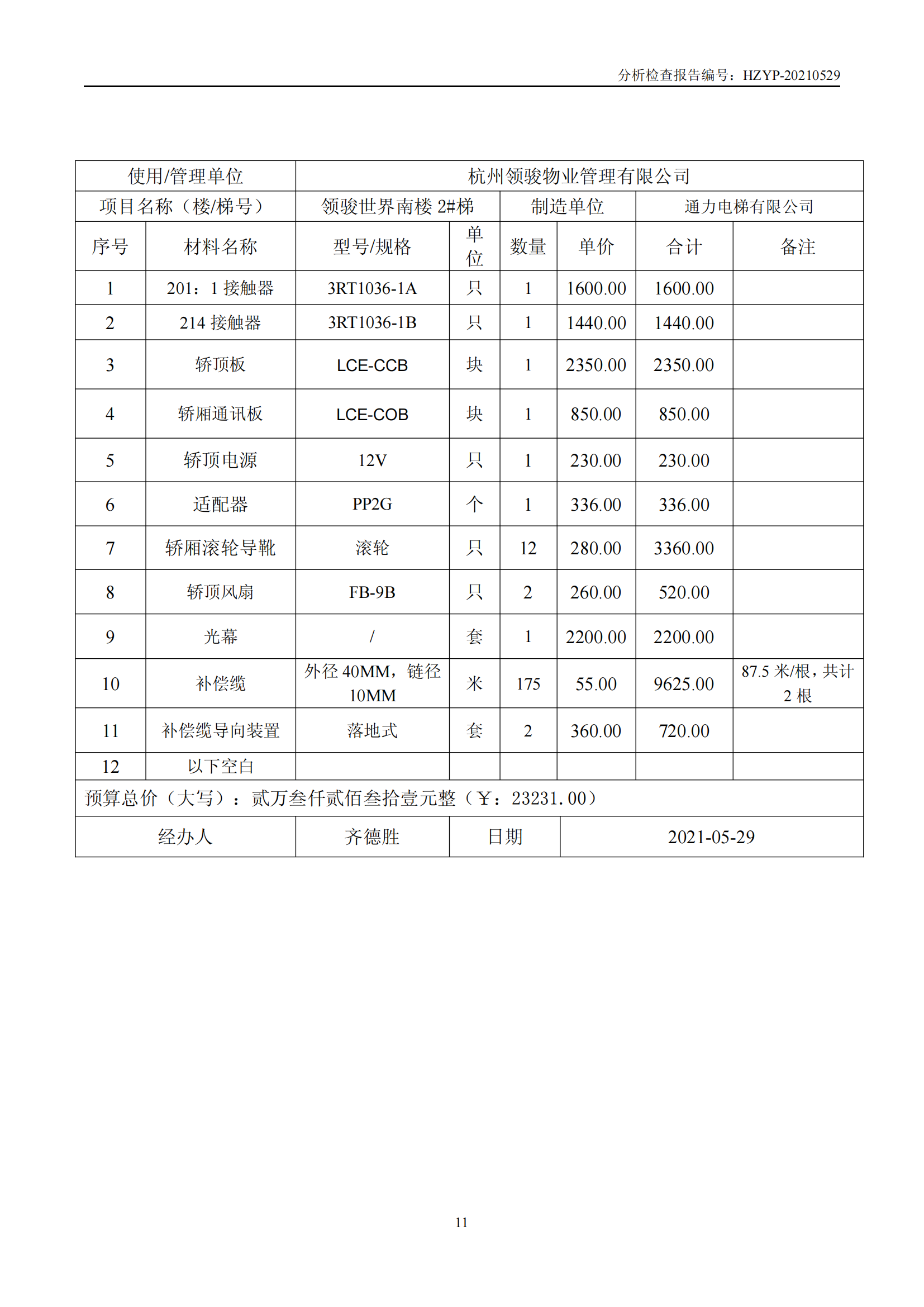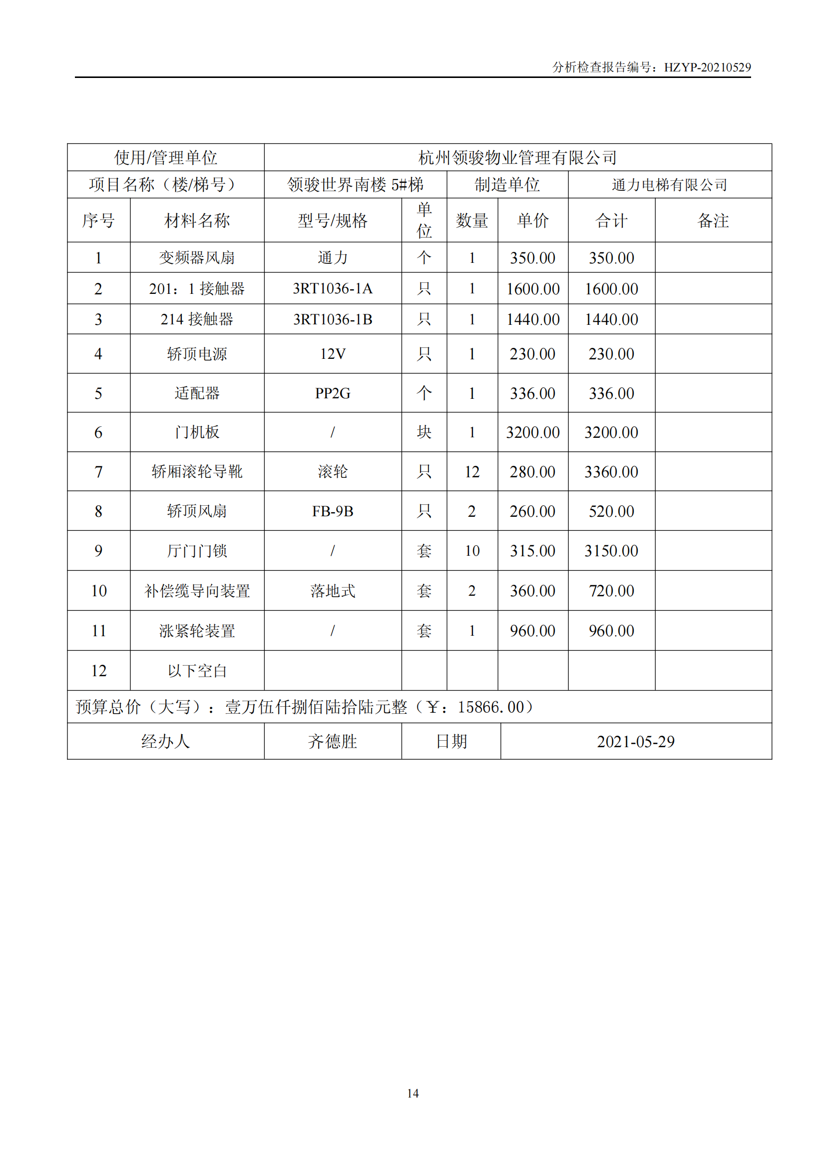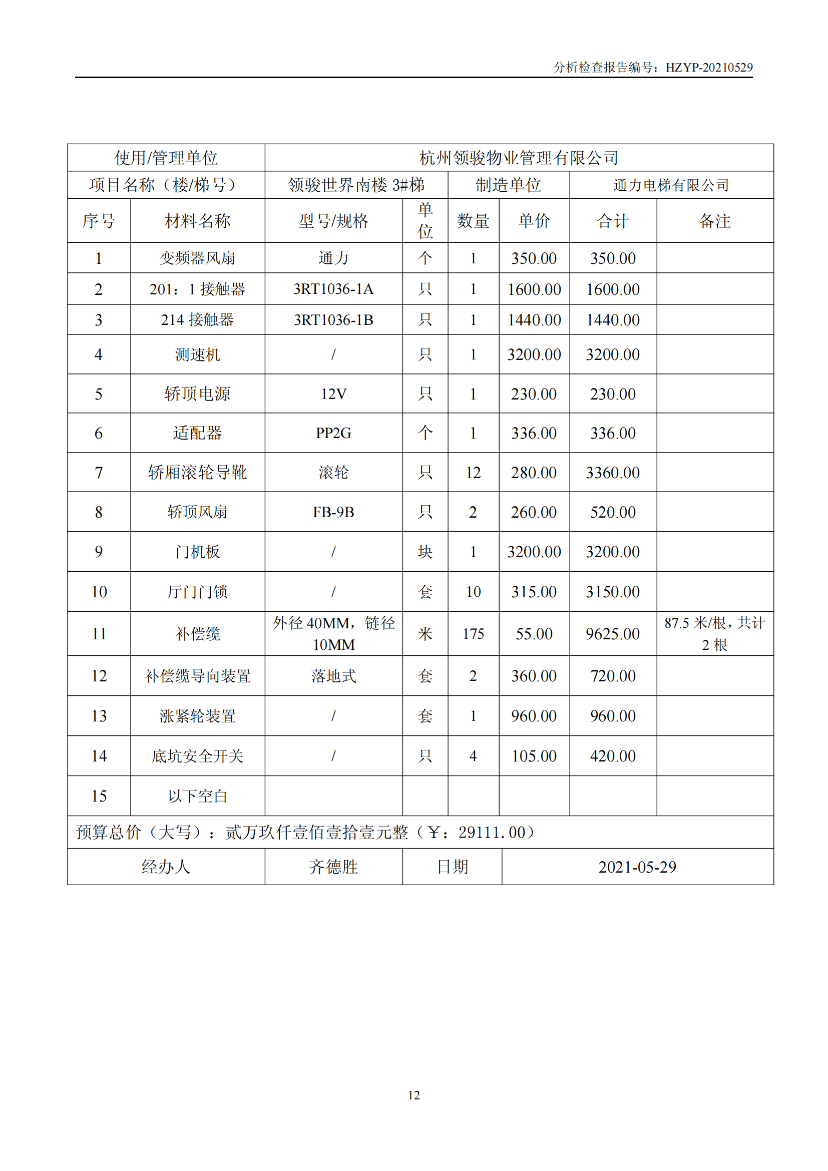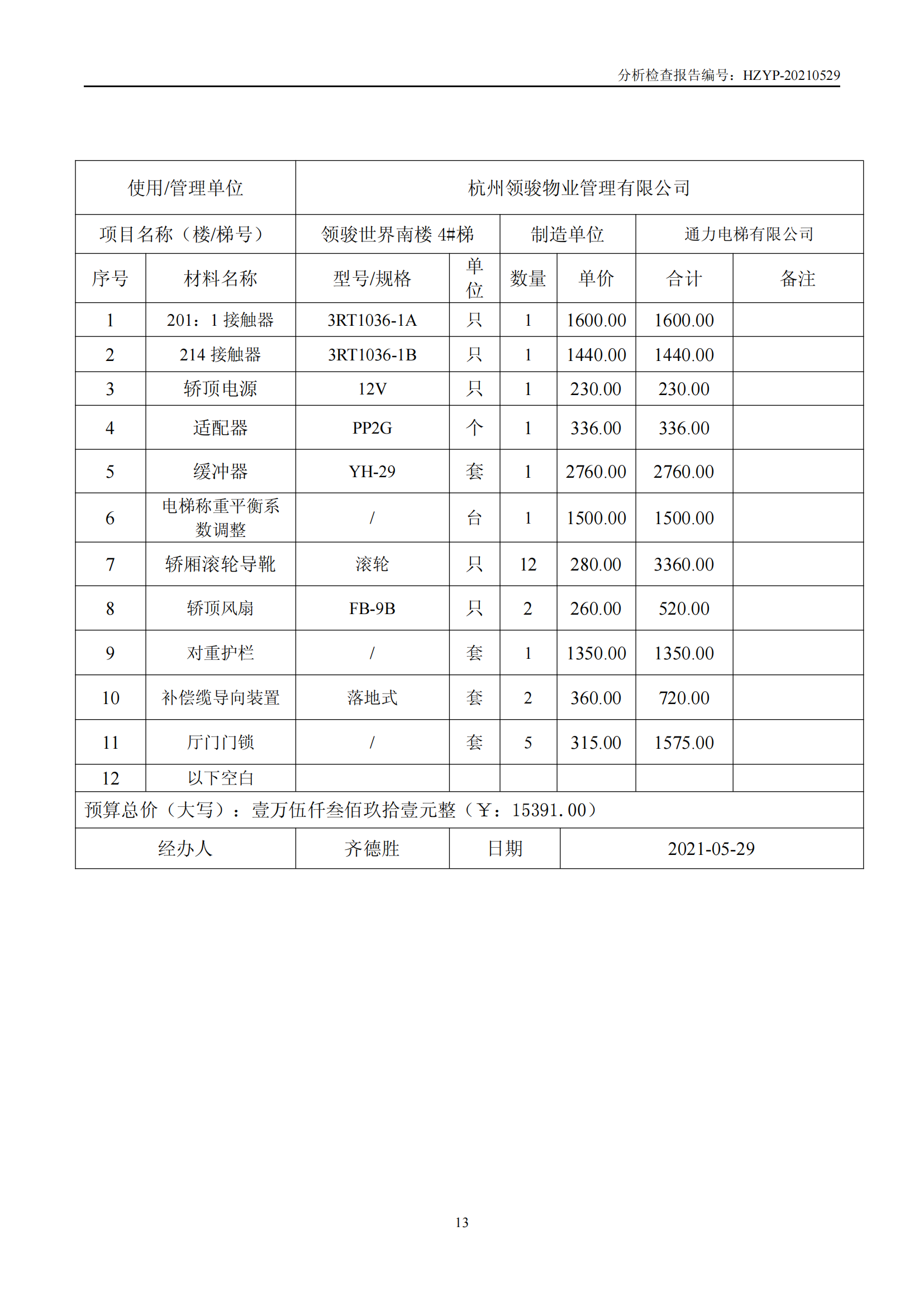 领骏世界电梯维修概算(领 骏 世 界 电 梯 检 查 报 告)