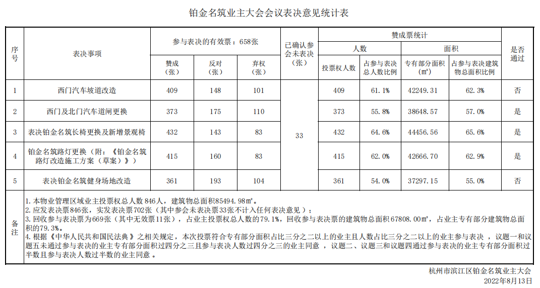 本物业管理区域业主大会会议于 2022 年 8 月 8 日至 2022 年 8 月 13 日在铂金名筑举行。会议就议题一:西门汽车坡道改造;议题二:西门及北门汽车道闸更换;议题三:表决铂金名筑长椅更换及新增景观椅;议题四:铂金名筑路灯更换(附:《铂金名筑路灯改造施工方案(草案)》);议题五:表决铂金名筑健身场地改造事项进行了表决,晶都社区对本次会议表决情况进行了监督,现就会议决定公告如下: