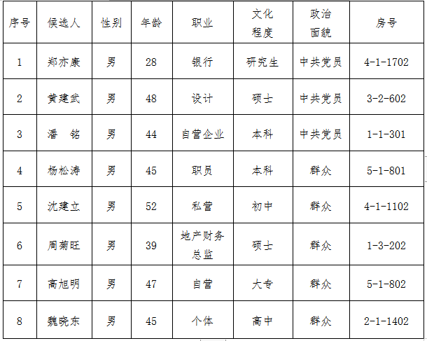 根据首届业主委员会委员候选人产生办法,在业主自愿报名的基础上,经业主大会筹备组审核,申慧社区监督,于2021年9月3日由10位报名人员及5位筹备组成员(应到15人,实到12人)共同进行推选产生8位候选人。确认本次候选人符合要求,候选人8人名单公示如下: