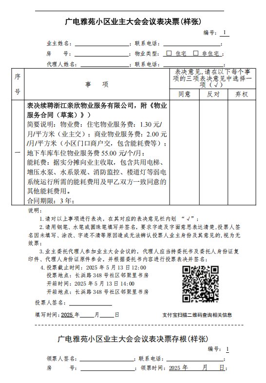 广电雅苑小区业主大会会议表决票(样张)