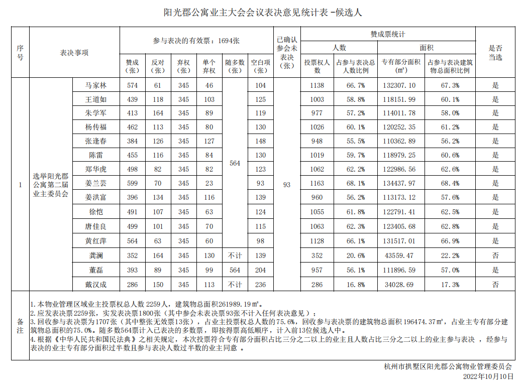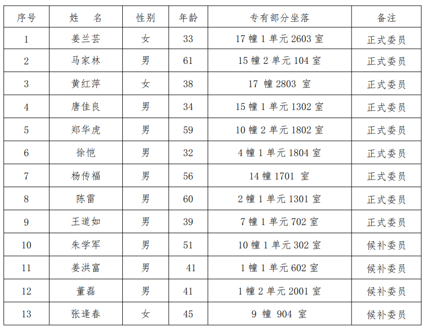 表决结果按得票高低选出13名业主委员会成员,名单如下: