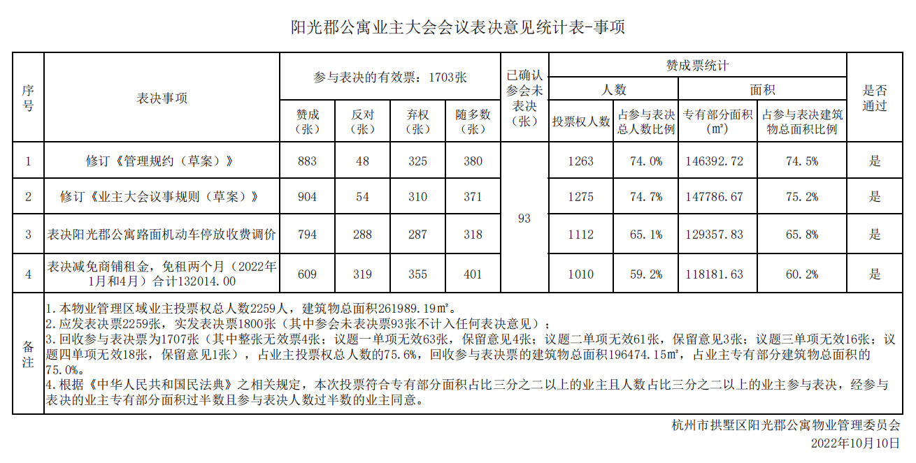 本物业管理区域业主大会会议于 2022 年 9 月 18 日至 2022 年 10 月 10 日在阳光郡公寓举行。会议就议题一:修订《管理规约(草案)》;议题二:修订《业主大会议事规则(草案)》;议题三:表决阳光郡公寓路面机动车停放收费调价;议题四:表决减免商铺租金,免租两个月(2022 年 1 月和 4 月)合计 132014.00;议题五:选举阳光郡公寓第二届业主委员会进行了表决,孔家埭社区对本次会议表决情况进行了监督,现就会议决定公告如下: