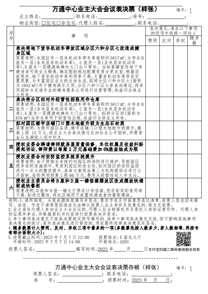 万通中心业主大会会议表决票(样张)