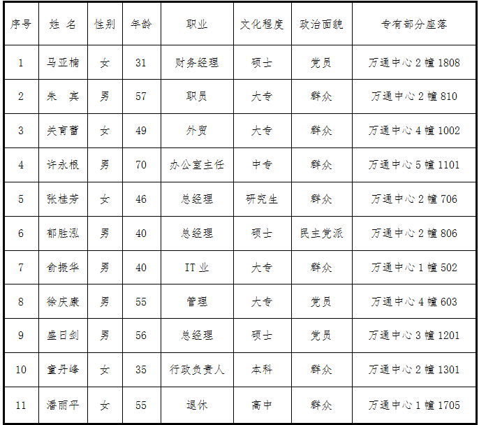 根据首届业主委员会委员候选人产生办法,在业主自愿报名的基础上,经业主大会筹备组审核,大浒路社区监督,确认本次候选人符合要求,候选人11人名单公示如下: