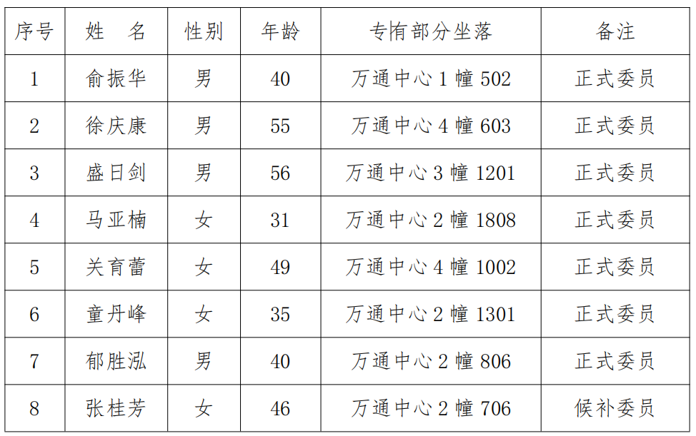 表决结果按得票高低选出 8 名业主委员会成员,名单如下: