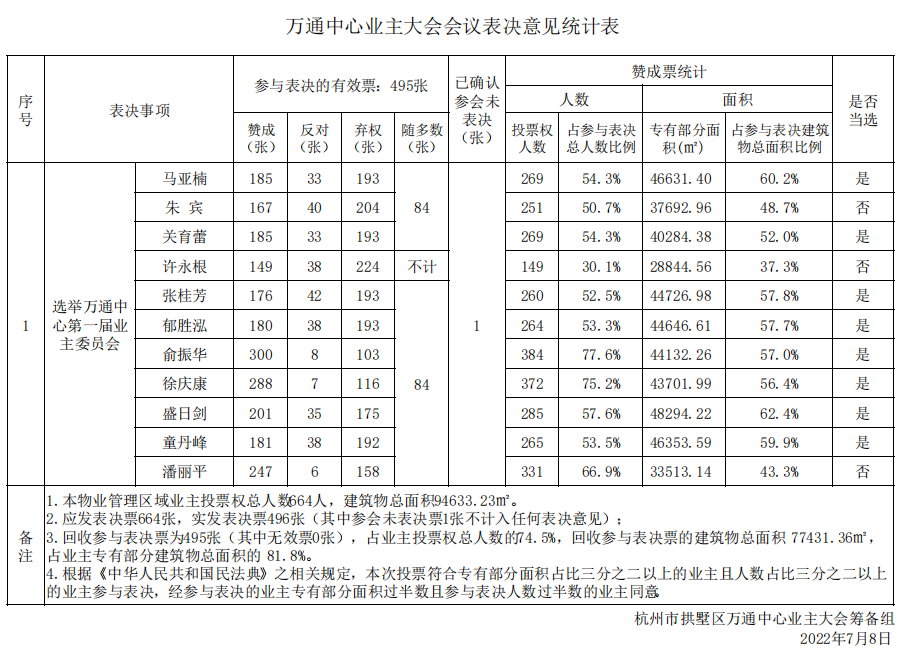 本物业管理区域业主大会会议于 2022 年 7 月 3 日至 2022 年 7 月 8 日在万通中心举行。会议就选举万通中心第一届业主委员会进行了表决,大浒路社区对本次会议表决情况进行了监督,现就会议决定公告如下: