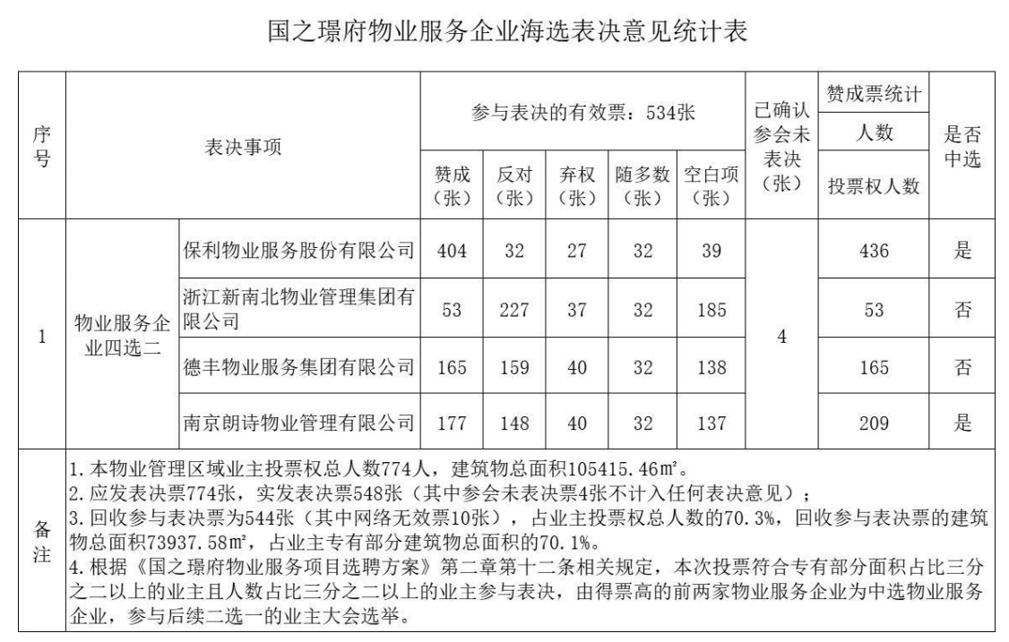 一、本次物业服务企业海选 通过 1.保利物业服务股份有限公司,2.南京朗诗物业管理有限公司为国之璟府中选物业服务企业,参与后续二选一的业主大会选举。
