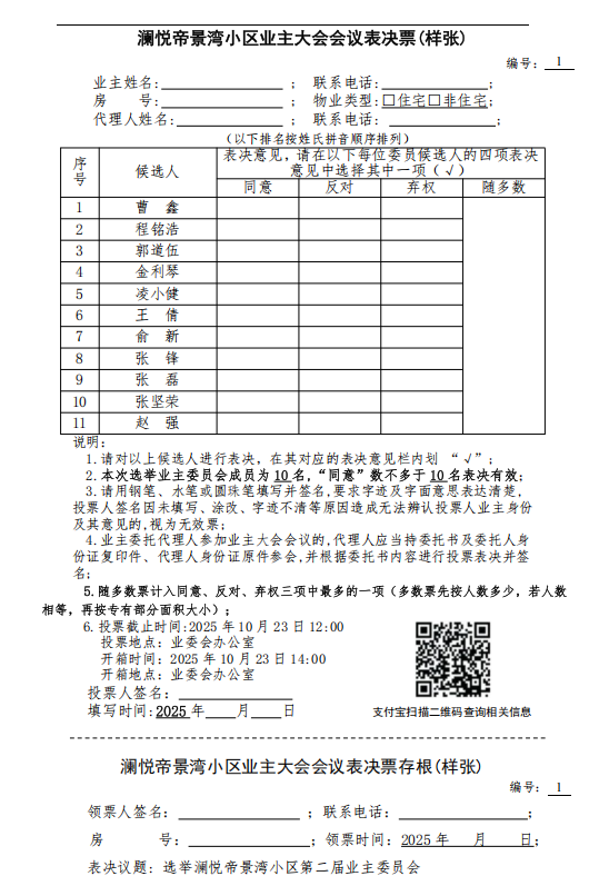 澜悦帝景湾小区业主大会会议表决票(样张)