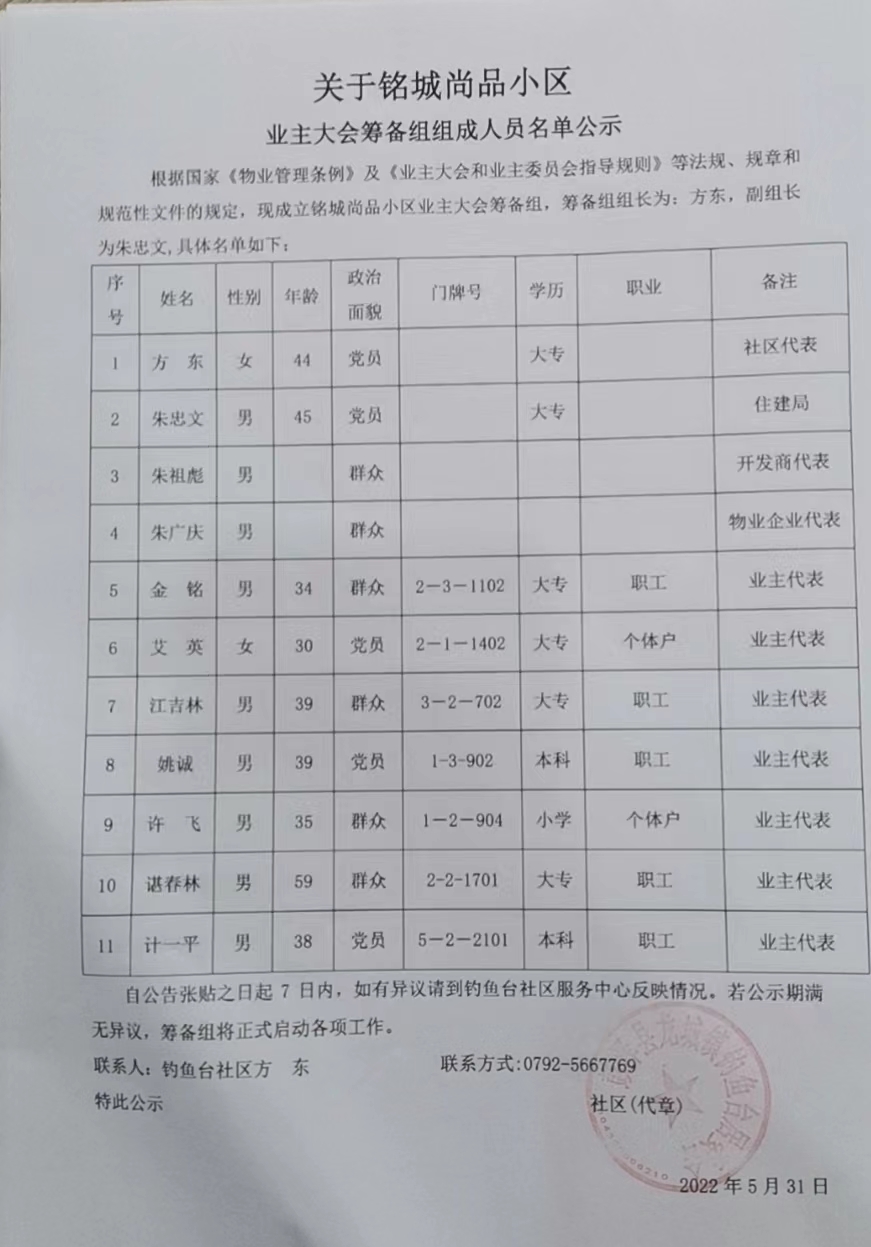 关于铭城尚品小区业主大会筹备组组成人员名单公示