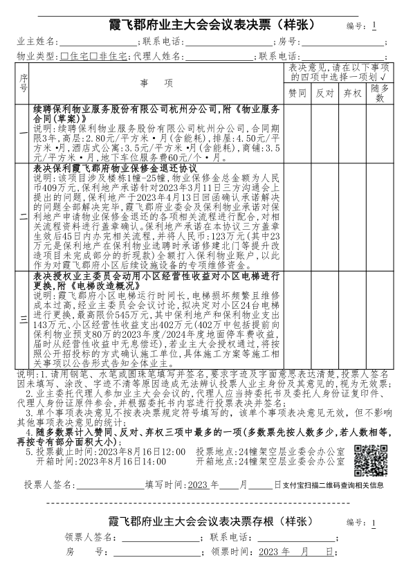霞飞郡府业主大会会议表决票(样张)