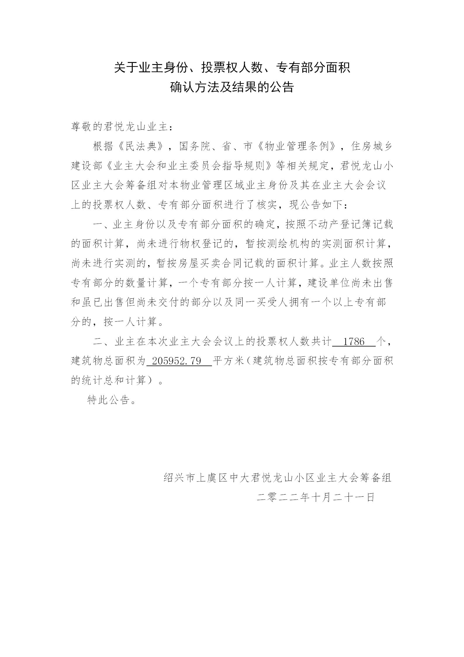 关于业主身份、投票权人数、专有部分面积确认方法及结果的公告