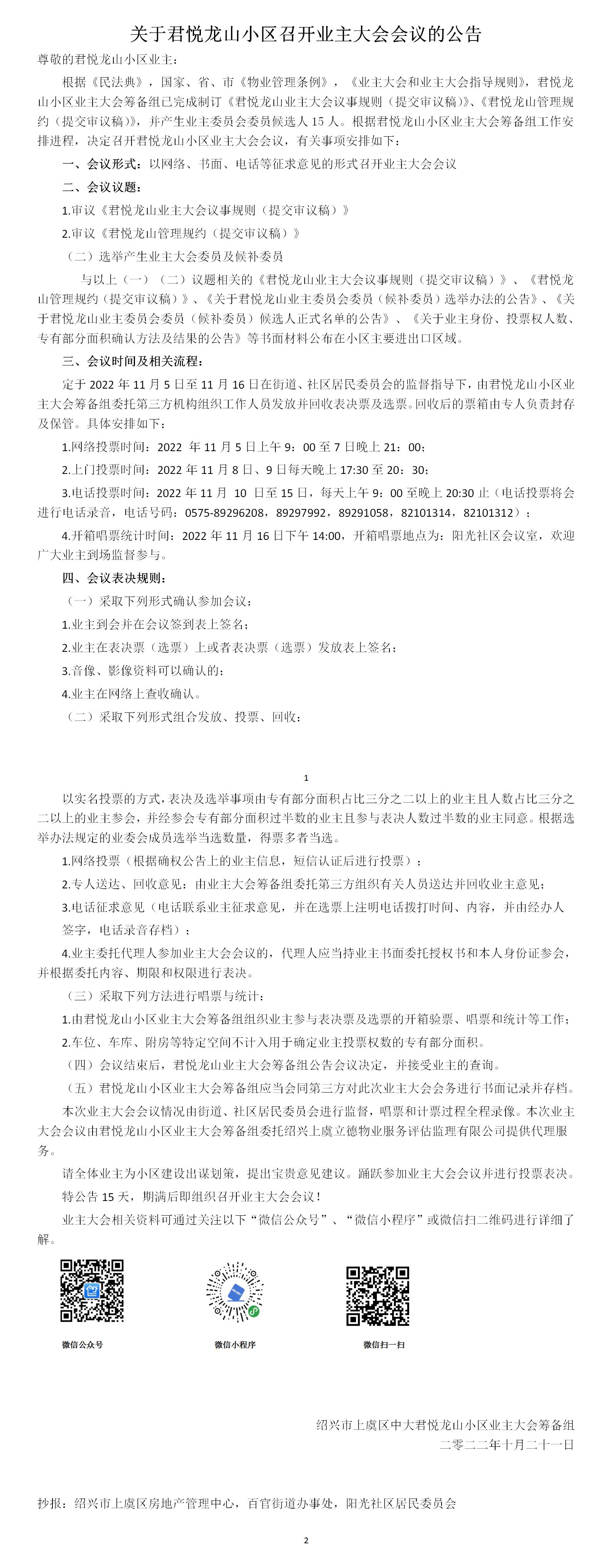 关于君悦龙山小区召开业主大会会议的公告