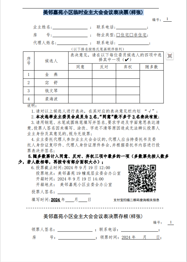 美邻嘉苑小区临时业主大会会议表决票(样张)
