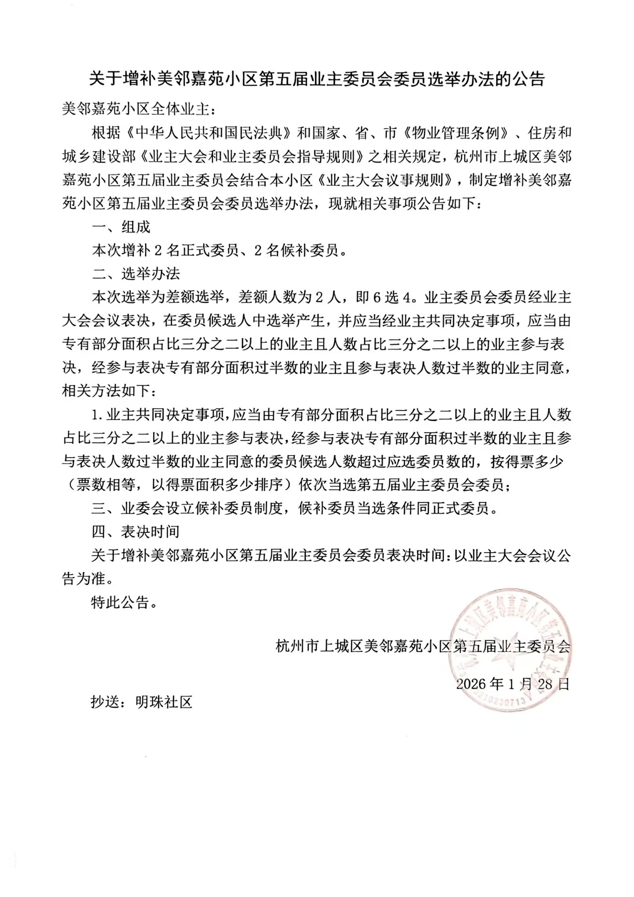 关于增补美邻嘉苑小区第五届业主委员会委员选举办法的公告