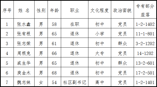 根据本届业主委员会委员候选人产生办法,在业主自愿报名的基础上,经草庄社区党组织审核,确认本次候选人符合要求,正式候选人7人名单公告如下: