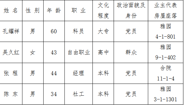 湖风雅园小区物业管理委员会自荐和推荐业主代表名单