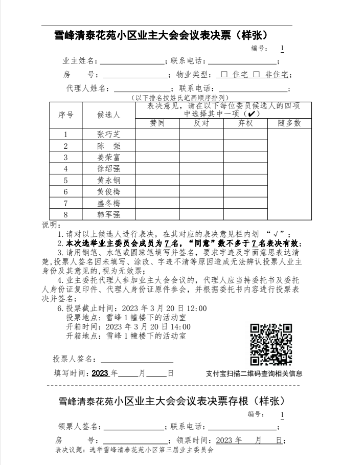 雪峰清泰花苑小区业主大会会议表决票(样张)