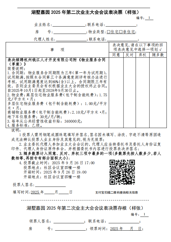 湖墅嘉园 2025 年第二次业主大会会议表决票(样张)