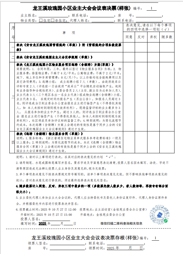 龙王溪玫瑰园小区业主大会会议表决票(样张)