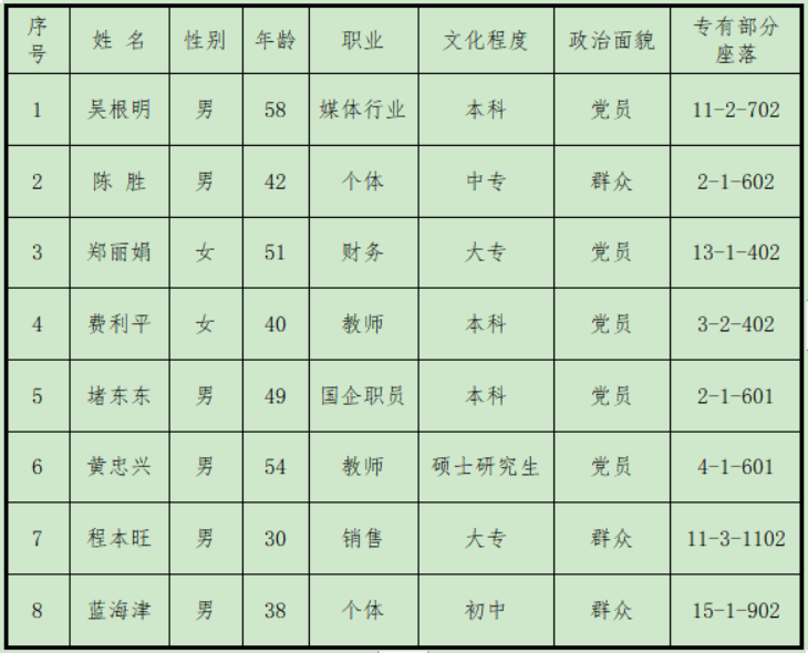 根据本届《业主委员会委员候选人产生办法》,在业主自愿报名的基础上,经龙山社区党组织审核,确认本次候选人符合要求,候选人8人名单公示如下: