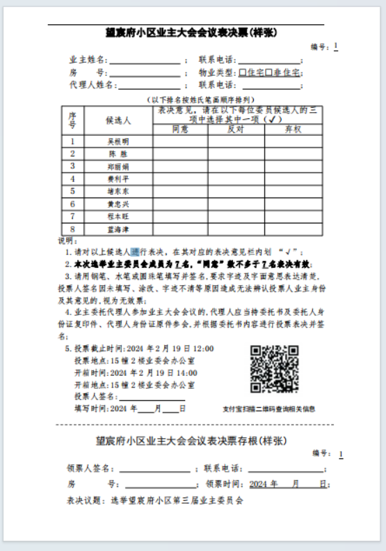 望宸府小区业主大会会议表决票(样张)