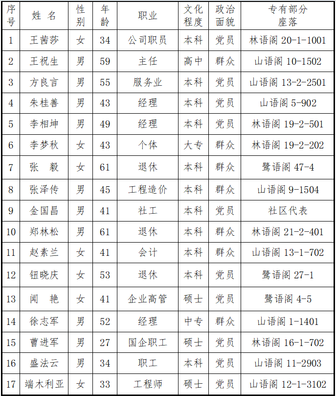 根据本届《关于青枫墅园第三届业主委员会委员候选人产生办法的公告》,在业主自愿报名的基础上有29位业主报名,经仓南社区党组织审核,确认本次候选人符合要求,并于2024年5月18日至5月19日进行推选,经各区域业主主动推选产生16名候选人,加社区代表1人,共17人。候选人17人名单公示如下: