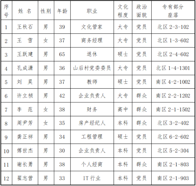 《东旭府第一届业主委员会委员候选人的初步公示》公示期间物业管理委员会未收到业主的书面意见。杭州市东旭府物业管理委员会将12名正式候选人名单提交业主大会审议并表决,根据业主大会会议决议产生东旭府第一届业主委员会。候选人12人名单公告如下: