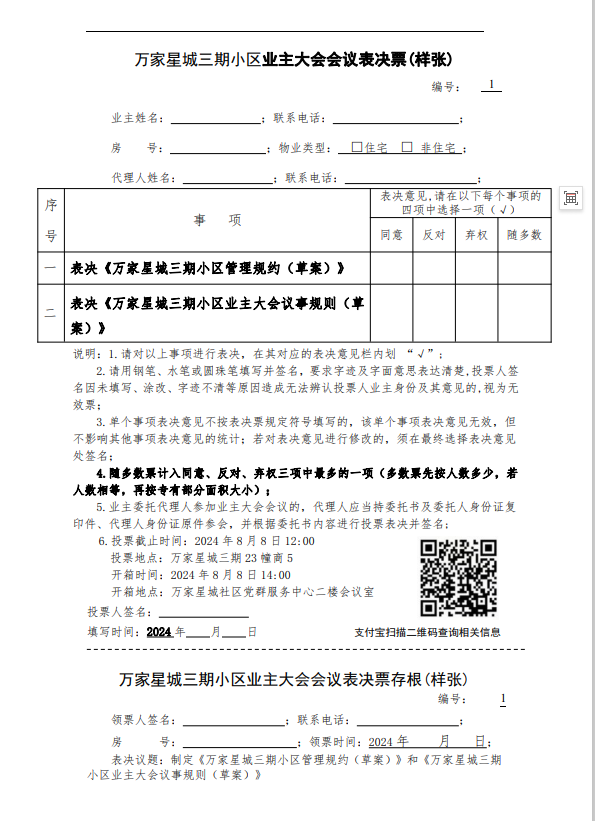 万家星城三期小区业主大会会议表决票(样张)