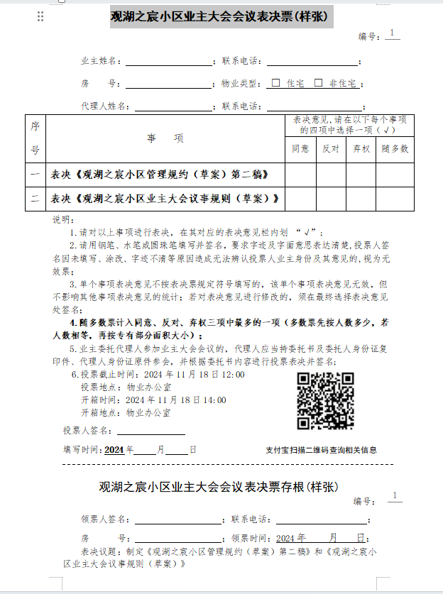 观湖之宸小区业主大会会议表决票(样张)