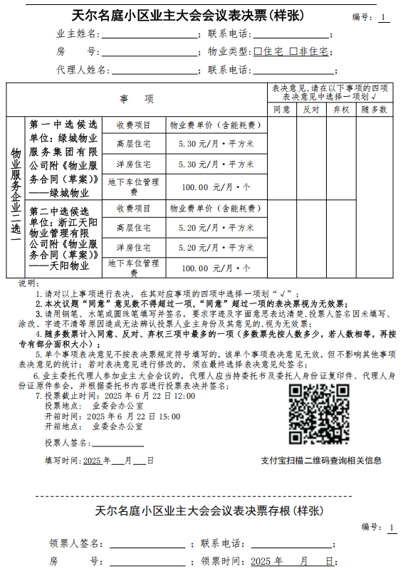 天尔名庭小区业主大会会议表决票(样张)