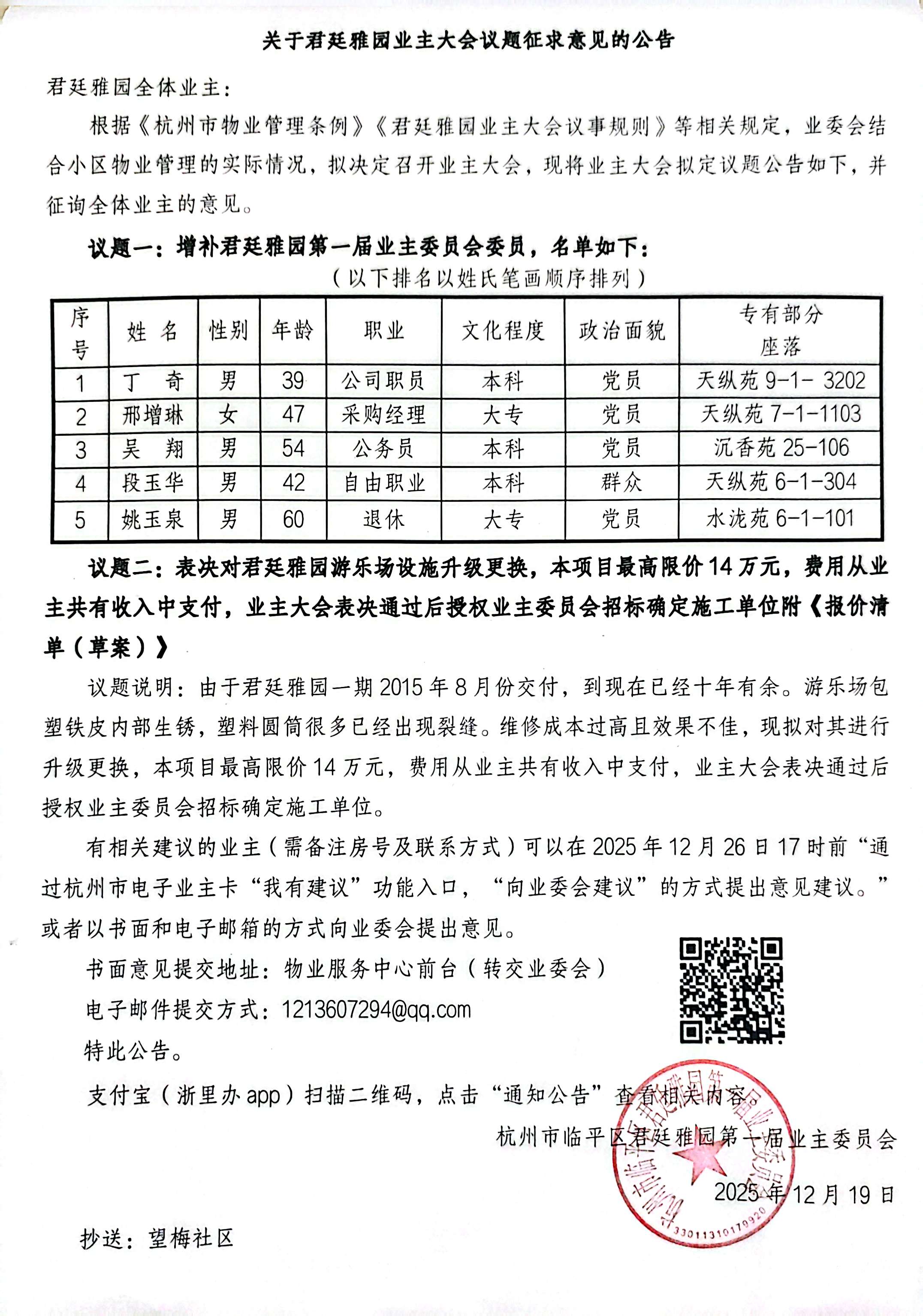 杭州市临平区君廷雅园第一届业主委员会