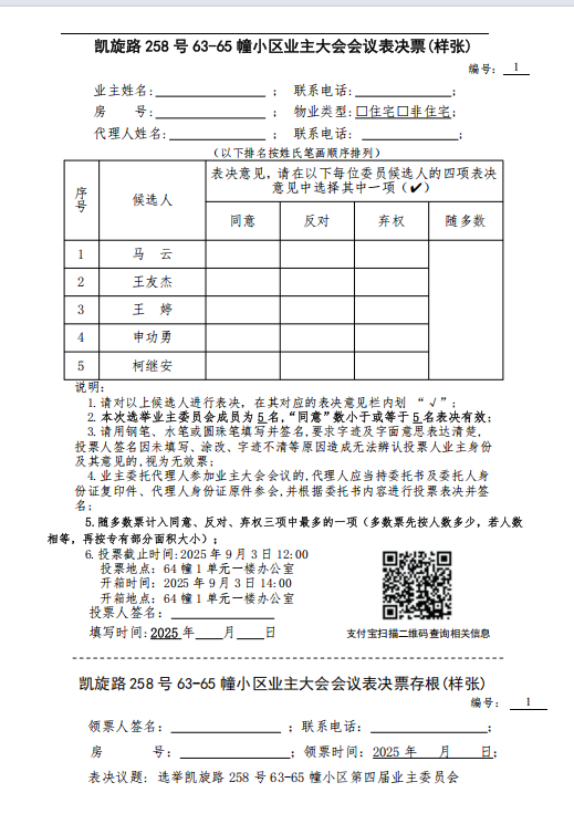 凯旋路 258 号 63-65 幢小区业主大会会议表决票(样张)
