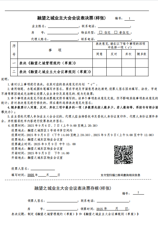 融望之城业主大会会议表决票(样张)