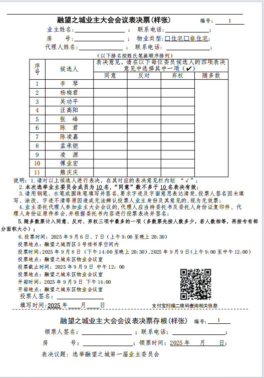 融望之城业主大会会议表决票(样张)