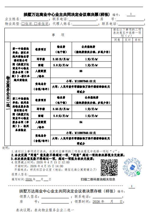 拱墅万达商业中心业主共同决定会议表决票(样张)