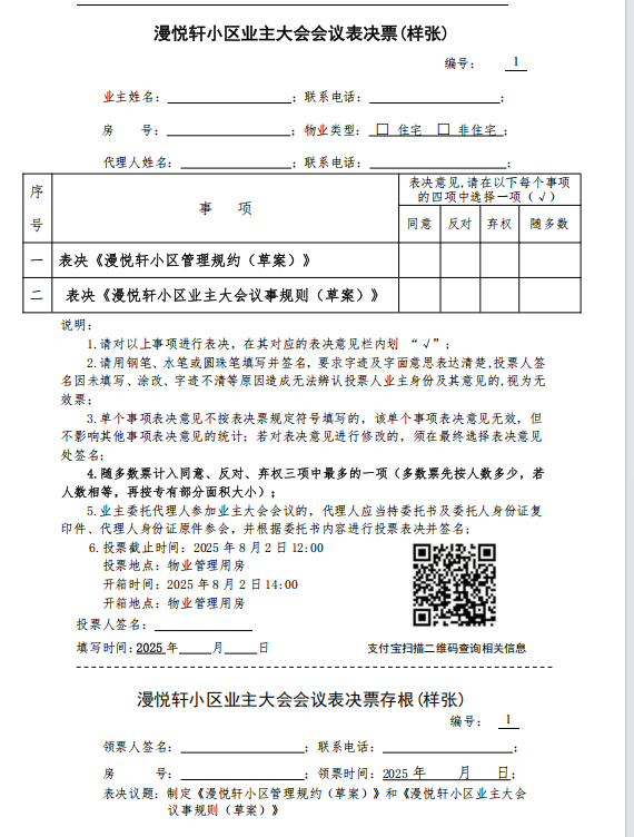 漫悦轩小区业主大会会议表决票(样张)