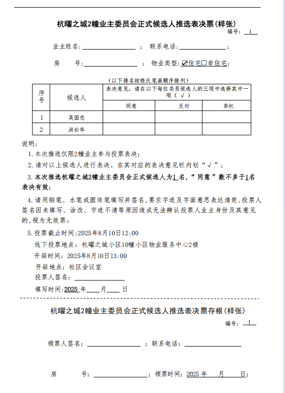 杭曜之城2幢业主委员会正式候选人推选表决票(样张)