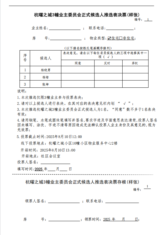 杭曜之城3幢业主委员会正式候选人推选表决票(样张)