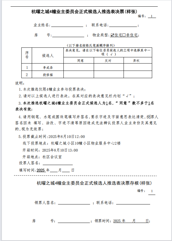 杭曜之城4幢业主委员会正式候选人推选表决票(样张)