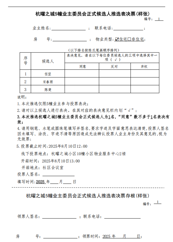 杭曜之城5幢业主委员会正式候选人推选表决票(样张)
