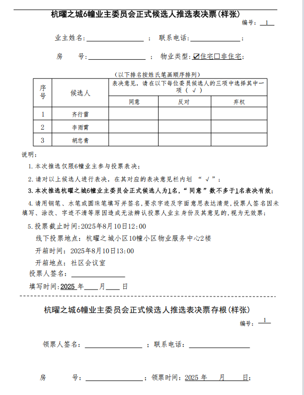 杭曜之城6幢业主委员会正式候选人推选表决票(样张)