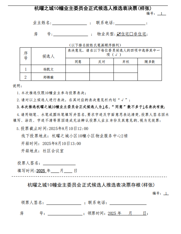 杭曜之城10幢业主委员会正式候选人推选表决票(样张)