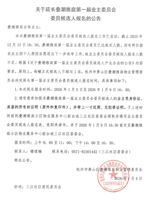 关于延长叠潮雅庭第一届业主委员会委员候选人报名的公告