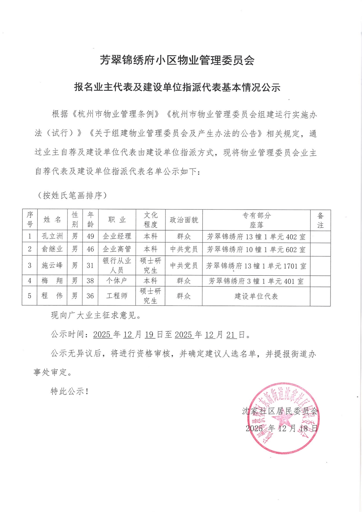 芳翠锦绣府小区物业管理委员会报名业主代表及建设单位指派代表基本情况公示