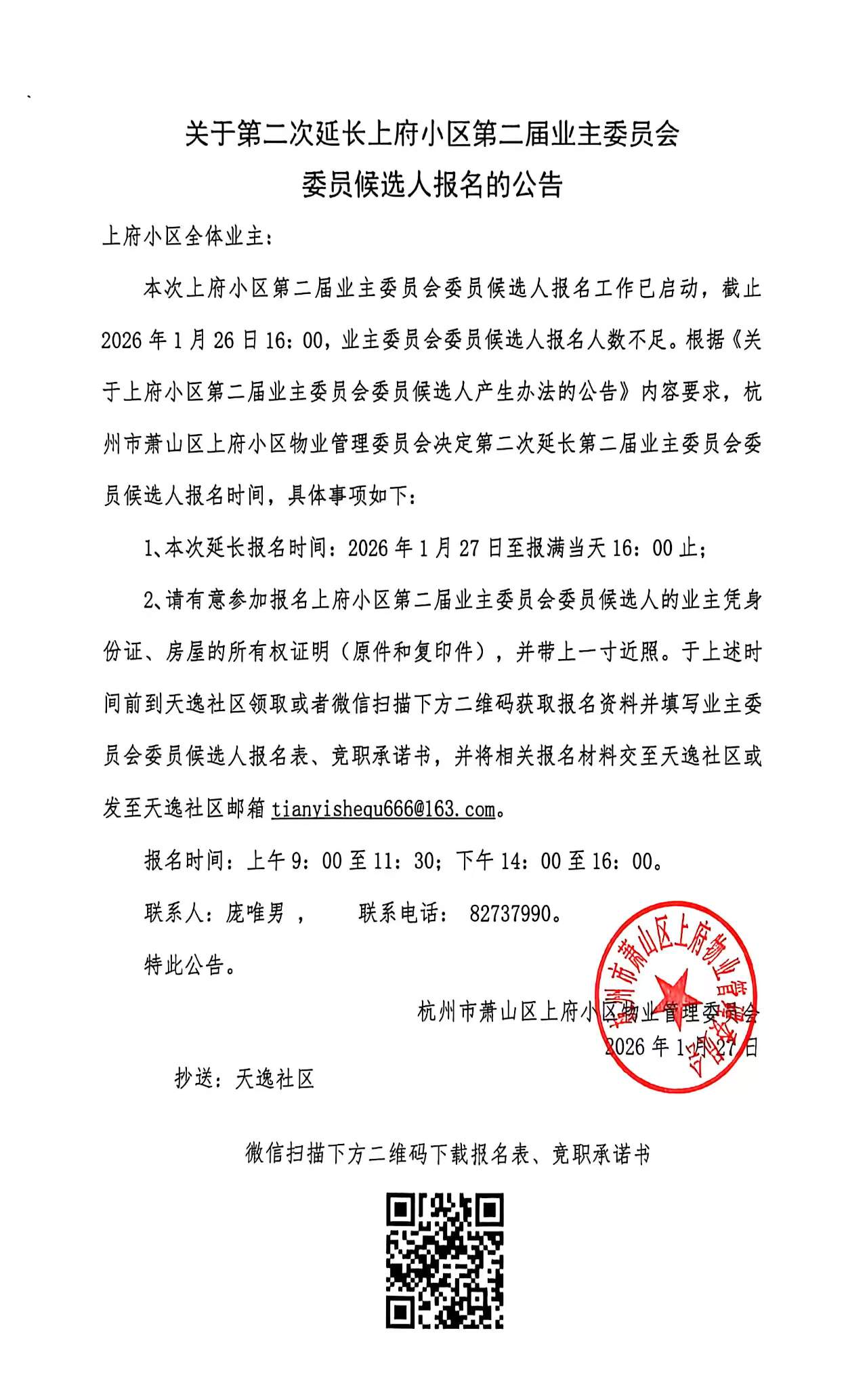 关于第二次延长上府小区第二届业主委员会委员候选人报名的公告