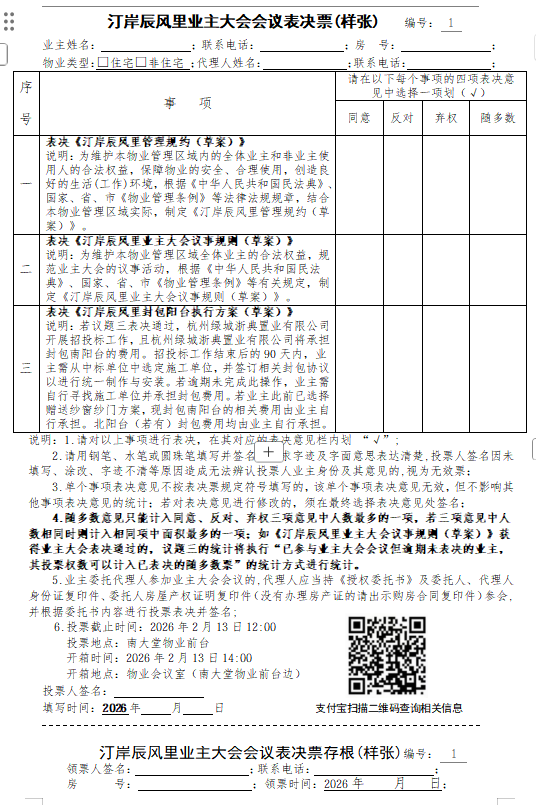 汀岸辰风里业主大会会议表决票(样张)